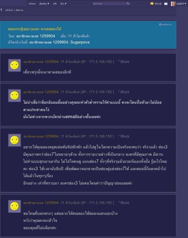 พอบอกว่าลองไปดูช่อง 7 สิ ก็บอกเป็นติ่งช่อง 7 (เราก็ไปคอมเมนท์บ้างเหมือนกัน ก็ไปดูช่อง 7 สิ ถ้าไม่ชอบเรื่องนั้น) ที่นี้ล่ะยาว