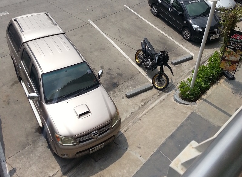 สถานการณ์จำลอง ในขณะที่เราขับมอเตอร์ไซค์ไปซื้อกับข้าว ที่ร้านตีช่องจอดเอาไว้ สี่ช่อง ไม่มีที่จอดมอเตอร์ไซค์ ช่องซ้ายสุดมีรถจอดอยู่แล้ว(รถหรูแค่สมมตินะ จริงๆ เป็นรถปกติ) ช่องถัดมามีมอเตอร์ไซค์จอ