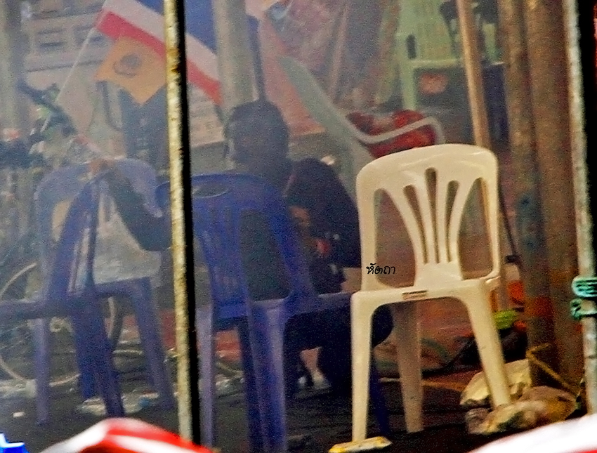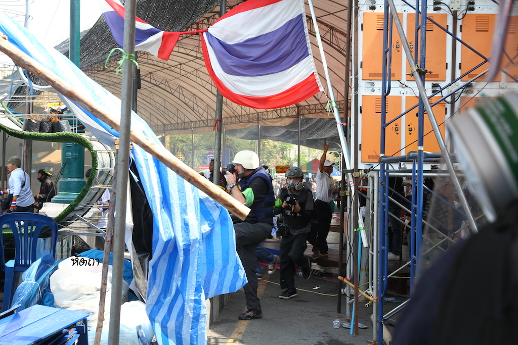 น่าจะเป็นภาพของพลอากาศโท วัชระ ฤทธาคนี หนึ่งแกนนำที่สะพานผ่านฟ้า กำลังบัญชาการอยู่กับการ์ดและภาพนี้ ซึ่งอยู่ในเต้นท์ ในขณะที่มีการขว้างระเบิดใส่ตำรวจ