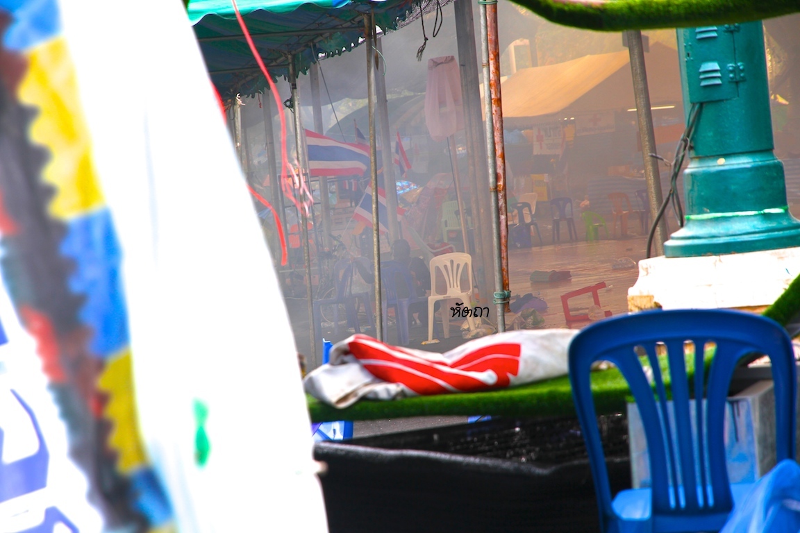 มีการจุดไฟซึ่งเริ่มไหม้หลังคาเต้นท์ของผู้ชุมนุมที่ตำรวจเข้าไปจับกุมผู้ต้องหาตามภาพที่หนึ่ง สังเกตุควันด้านซ้ายของภาพ ซึ่งขณะนั้นไม่มีใครอยู่ที่เต้นท์แล้ว ( ในทางยุทธวิธีคือการพรางตัว )