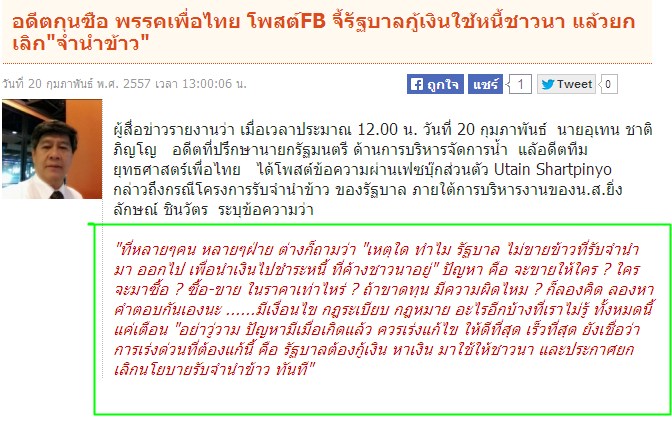 http://www.matichon.co.th/news_detail.php?newsid=1370657548&grpid=03&catid=&subcatid= ชาวนามีรายได้เพิ่ม? มีรถ 6 ล้อ 10 ล้อ ขนข้าวไปสวมสิทธิ์ขายข้ามเขต หากไม่พูดถีงเรื่องนโยบายที่ทำให้ร