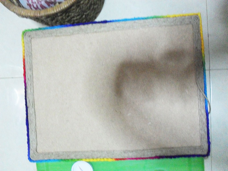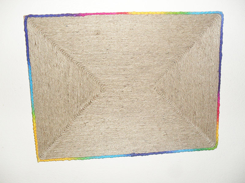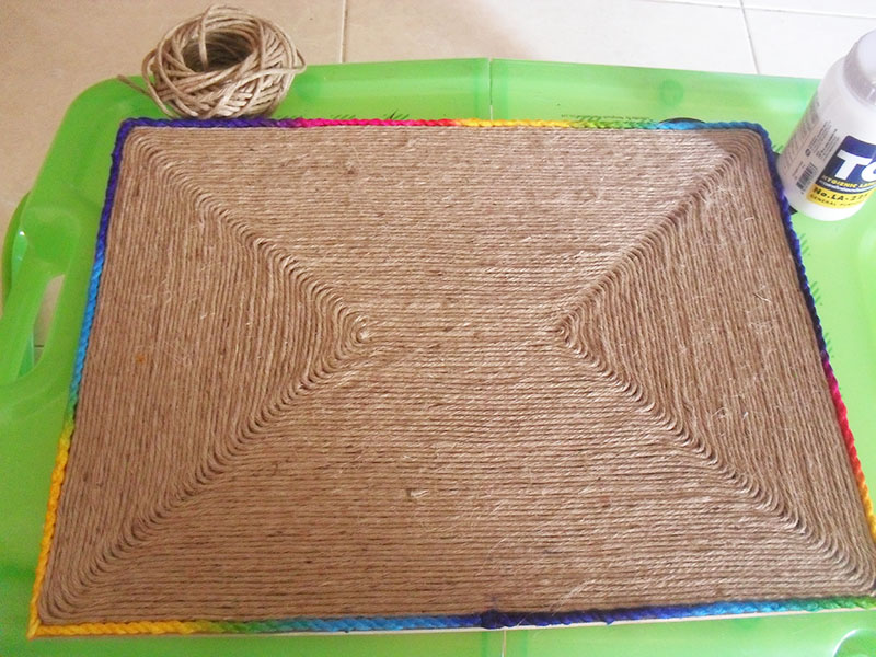 ใช้เชือกปอทากาวและติดไล่ไปตามขอบกระดานไปเรื่อยๆ เป็นรูปสี่เหลี่ยม (เชือกที่เป็นสี เหลือ เลยเอามาตกแต่ง)