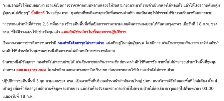 “ผมบอกแล้วให้ถอนออกมา เอาแค่เปิดการจราจรจากถนนหลานหลวงให้รถสามารถตรงมาที่ราชดำเนินกลางได้พอแล้ว แล้วให้เจรจากดดันกลุ่มผู้ชุมนุมไปเรื่อยๆ” บิ๊กสีกากี ในวอร์รูม ศรส. พูดก่อนที่จะเกิดเหตุระเบิดที่สะพานผ่านฟ้า....... อ่านต่อได้ที่ :