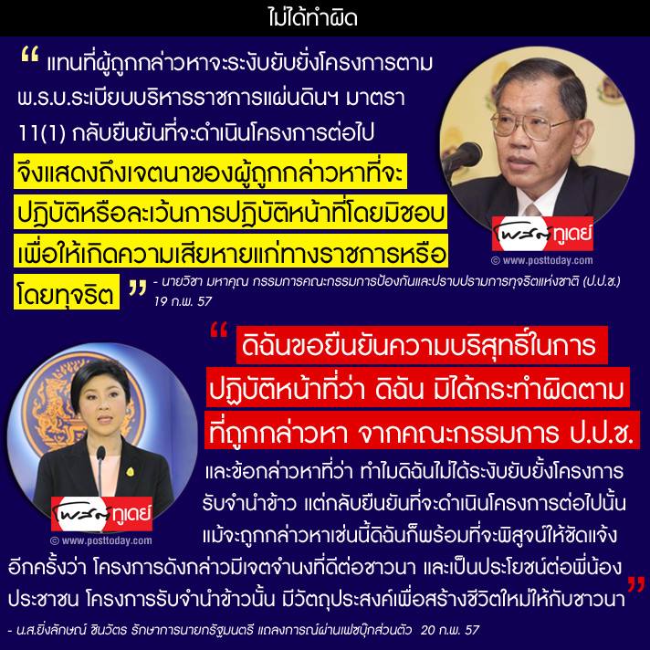 ทั้งที่ข้อเท็จจริงคดีทุจริตโครงการรับจำนำข้าวมีการสืบสวนสอบสวนเก็บข้อมูลพยานหลักฐานมาเป็นเวลา 1 ปี มิใช่ 21 วันตามที่นายกฯ แถลงแต่อย่างใด อีกทั้งการจับแพะชนแกะนำองค์กรอิสระโยงขบวนการล้มล้างรัฐบาลก็ไม่ได้มีหลักฐานอะไรชี้ชัด อ่านต่อ >>