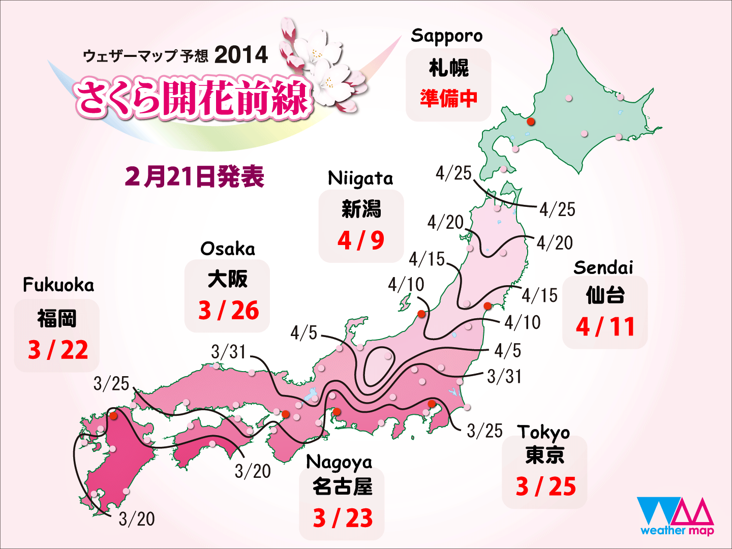 มาอัพเดตพยากรณ์ซากุระค่ะ ^^ ข้อมูลจาก http://sakura.weathermap.jp/smt/ ประกาศเมื่อวันที่ 24/01/2014 เวลา 10:00 น. ภาพรวมวันที่คาดว่าจะเริ่มบาน 「 開花予想」「開花日」(เดือน/วันที่) Fukuoka 3/20 -- Nagoya 3/23
