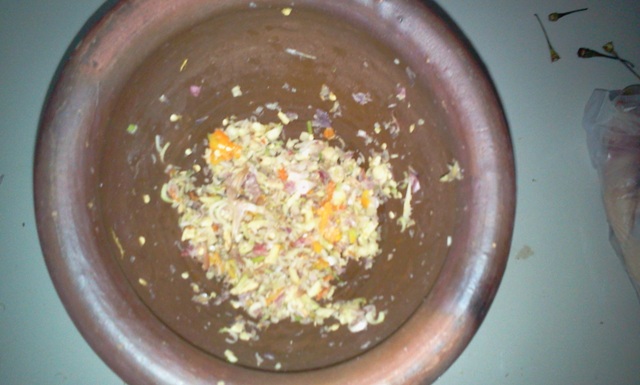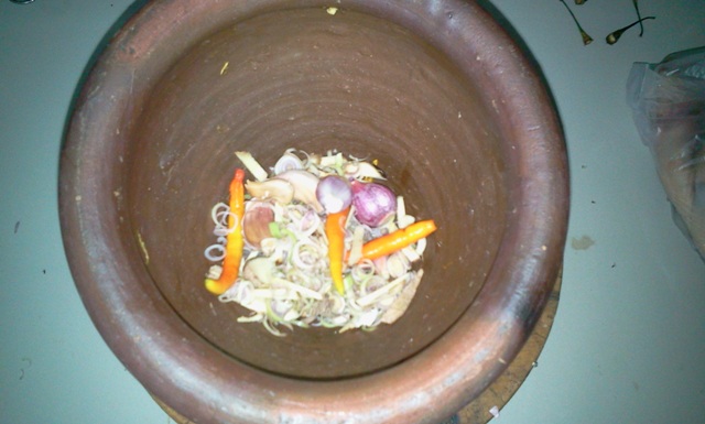 ข่า ตะไคร้ กระเทียม หอมแดง พริกสด/พริกแห้ง ซอยหยาบๆ ใส่ลงครกไป โขลกหยาบๆก็พอ
