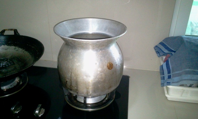 เอาผ้าขาวบางชุบน้ำบิดหมาดๆรองปากหม้อนึ่ง เอาถาดอลูมิเนียมวางทับ ใส่น้ำลงไปครับ เปิดเตาแก๊ส