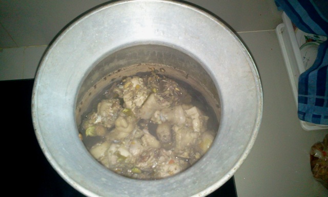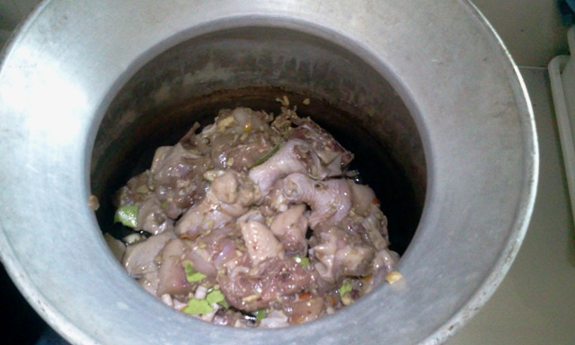 มาเตรียมอุปกรณ์กัน เอาหม้อนึ่งมาล้างให้สะอาด เทไก่ลงไปเลย ไม่ต้องใส่น้ำนะครับ