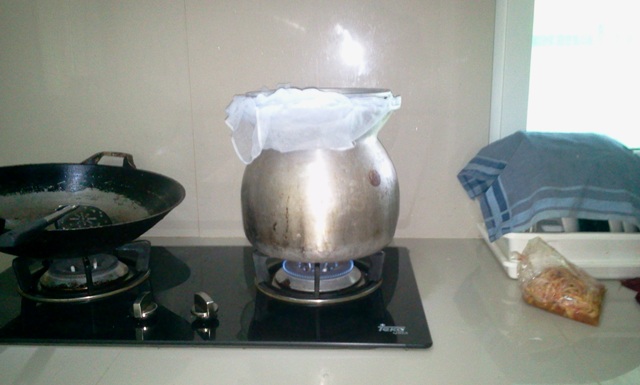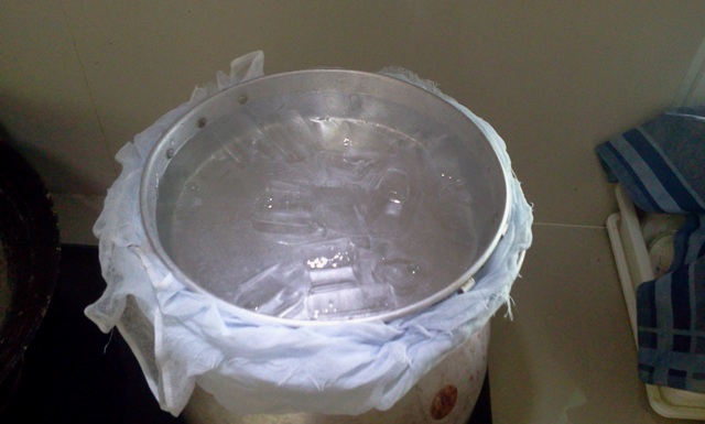 เอาผ้าขาวบางชุบน้ำบิดหมาดๆรองปากหม้อนึ่ง เอาถาดอลูมิเนียมวางทับ ใส่น้ำลงไปครับ เปิดเตาแก๊ส ใช้ไฟอ่อนๆเท่านั้น ขั้นตอนต่อไปนี้สำคัญครับ เราต้องหมั่นเช็คน้ำที่เราใส่ในถาดอลูมิเนียม ถ้าอุ่น ตักออก เทน้ำเย็นใส่ใหม่ ผมแอบโกง ใส่น้ำแข็งเลย สบาย
