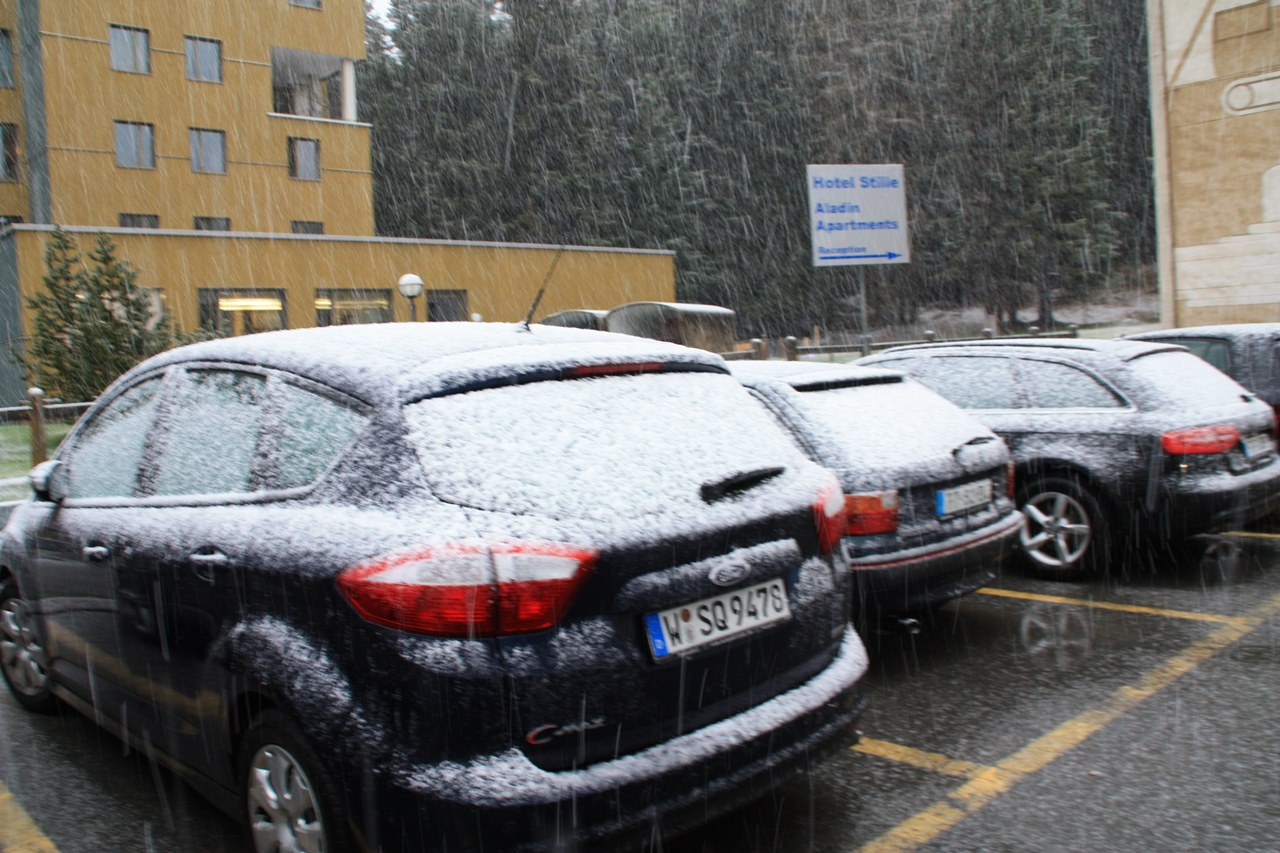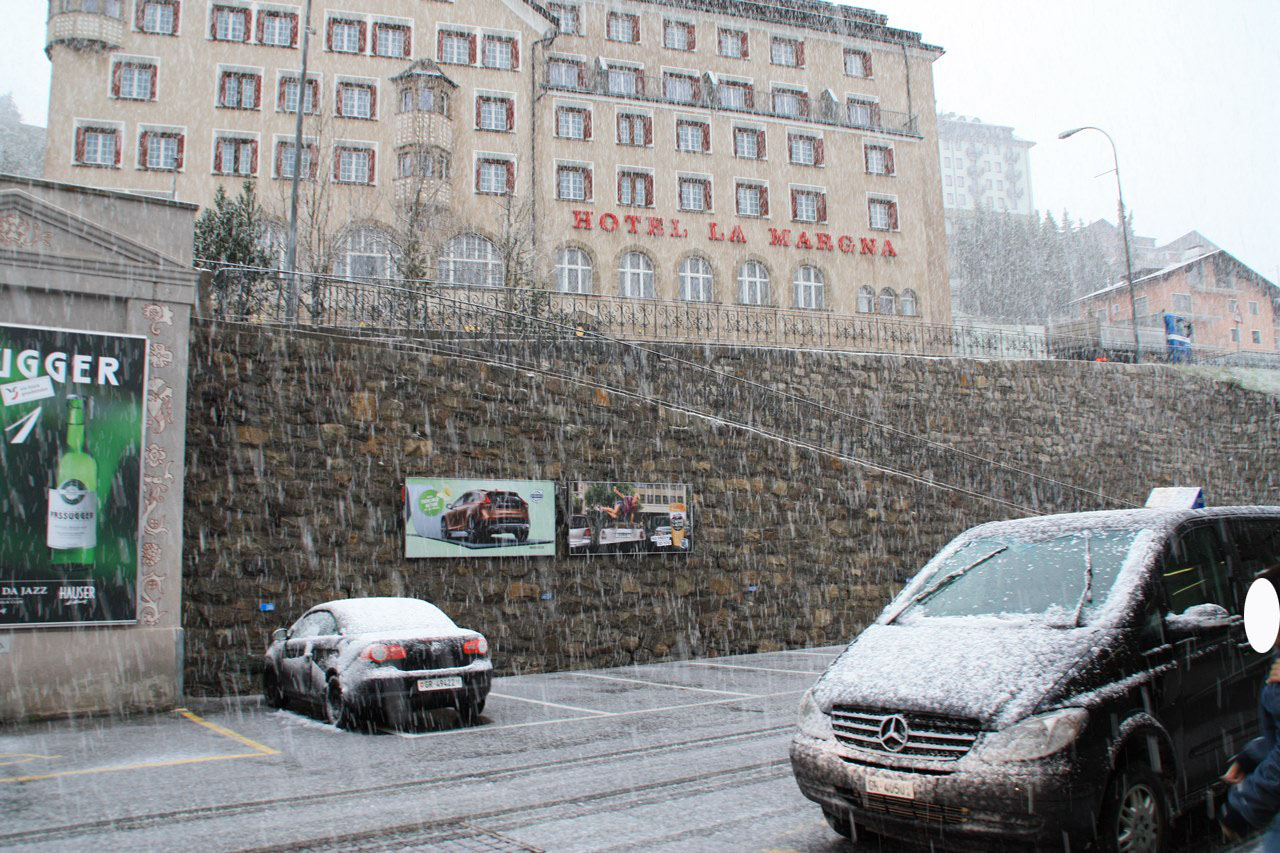 มาต่อกันที่ตอนเช้าของเมือง St.moritz ครับ ตื่นมาตอนเช้าหิมะตกหนักมาก เราเลยต้องเรียกแท็กซี่พา เพื่อให้พาไปส่งสถานีรถไฟ