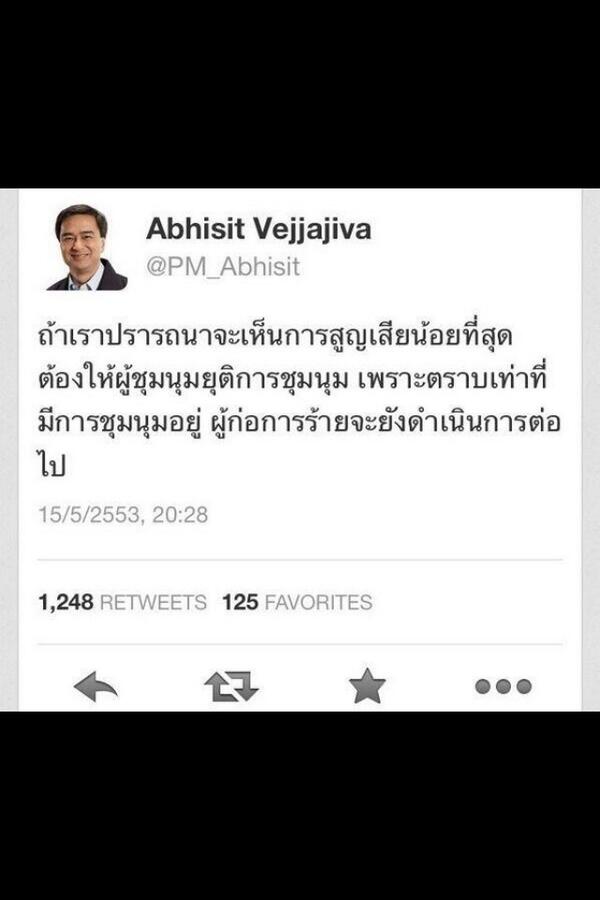 จาก มติชนออนไลน์ http://www.matichon.co.th/news_detail.php?newsid=1390055696&grpid=00&catid=&subcatid= ′มาร์ค′โวยผู้ไม่หวังดีแชร์ทวิตเตอร์ปี53 ปัดเรียกร้องให้กปปส.ยุติชุมนุม