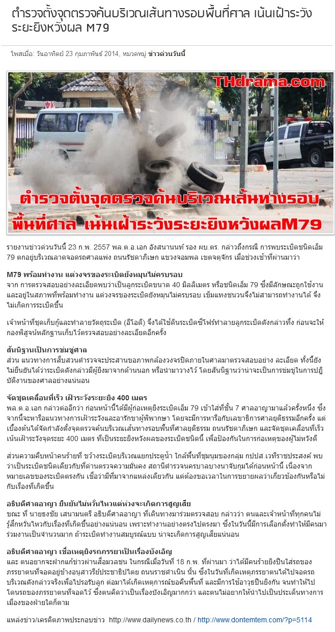 ยิงM79กปปส.แจ้งวัฒนะ2ลูกซ้อน-ไร้เจ็บ ป่วน! ยิง M79 กปปส.แจ้งวัฒนะ 2 ลูกซ้อน - ไร้เจ็บ ขณะ หลวงปู่ สั่งการ์ดกระจายกำลังรอบพื้นที่ รปภ.เข้มงวด เมื่อเวลา 20.30 น. ได้เกิดเหตุผู้ไม่หวังดี สร้างสถานการณ์ทำ