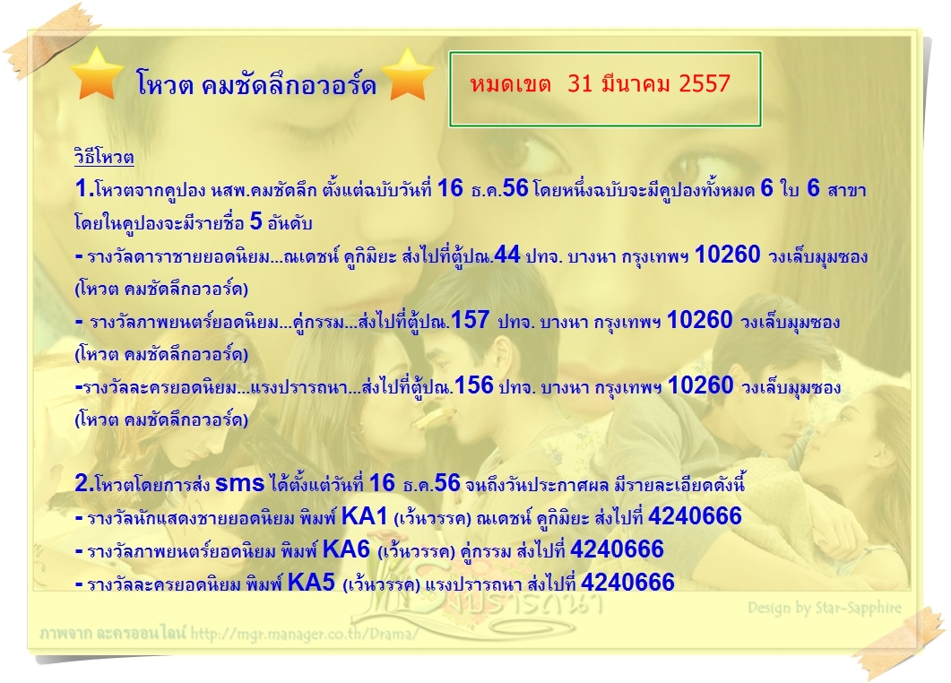 - สามารถโหวตได้ 10 นาทีต่อ 1 ครั้งผ่านเว็บไซต์ : http://www.komchadluek.net/vote-11
