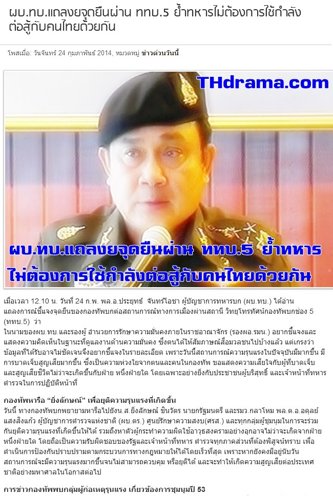 http://www.youtube.com/watch?v=NRhsr2wq0Xw&feature=youtu.be# พลเอกประยุทธ์ จันทร์โอชา ผู้บัญชาการทหารบก แถลงผ่านสถานีวิทยุโทรทัศน์กองทัพบกช่อง 5 ชี้แจงบทบาทของกองทัพท่ามกลางสถานการณ์ความขัดแย้ง