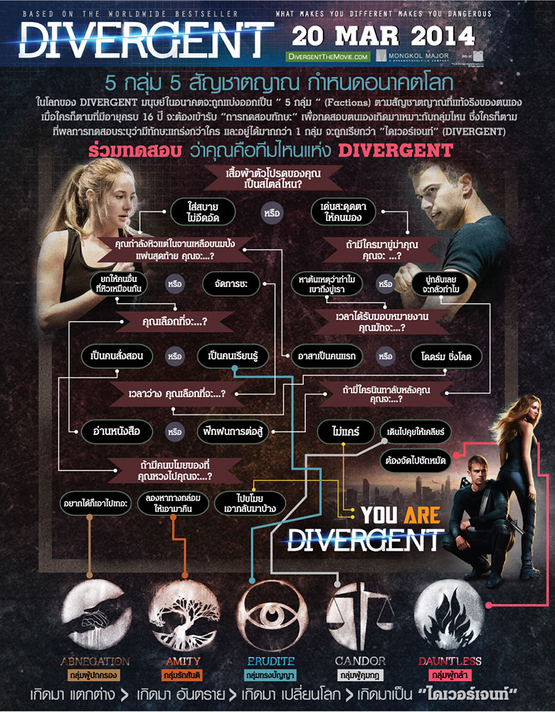 Divergent เรื่องราวในอนาคตของสังคมเมืองชิคาโก้ ที่มนุษย์ต้องแบ่งออกแบบ 5 กลุ่มตามลักษณะนิสัย และแต่ละกลุ่มก็จะมีหน้าที่และลักษณะการดำเนินชีวิตที่แตกต่างกัน นั่นก็คือ