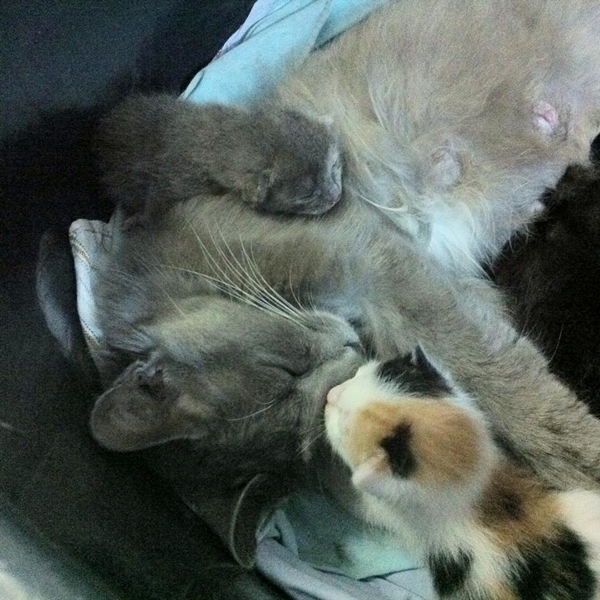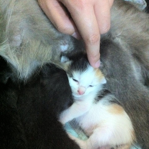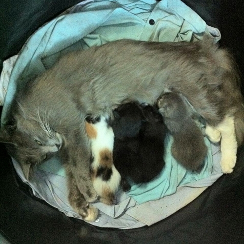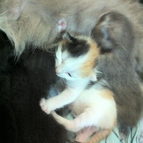 พอดีมีแมวหลงมา รูปร่างหน้าตาสวยน่ารักมาก มาติดพันตัวผู้แถวบ้านเรา แล้วนางก็ตั้งท้อง เพิ่งจะคลอดลูกค่ะ อายุเด็กๆ 2 สัปดาห์กว่าๆ