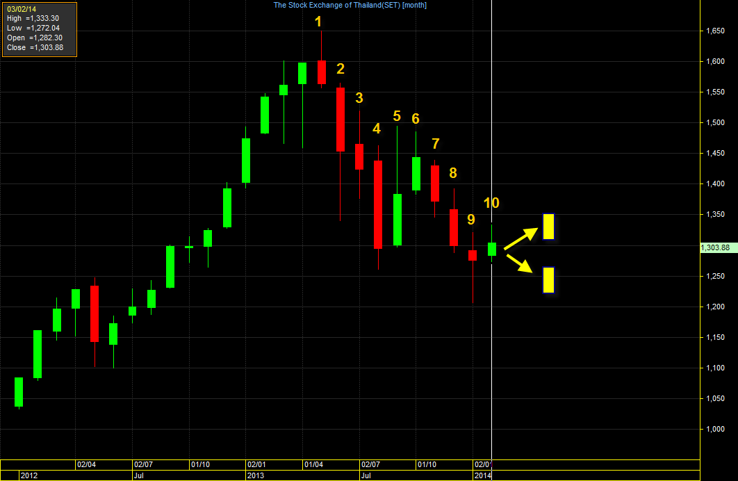 10 เดือนแล้วนะครับ ที่เป็นตลาดขาลง มาดูว่าแท่งเดือนมีนาคม จะเปิดไหลต่ำหรือกลับขึ้นสูง ตามทฤษฏี เด้า