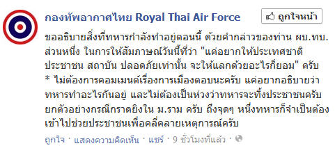 กองทัพอากาศ โพสต์เฟซบุ๊ก ยืนยันทหารไม่ทิ้งประชาชน หากถึงจุดหนึ่งที่จำเป็น จะเข้าช่วยเหลือเพื่อคลี่คลายเหตุการณ์ พร้อมยึดมั่นคำกล่าว ผบ.ทบ. ขอให้ประเทศชาติ ประชาชน สถาบันปลอดภัย จะแลกด้วยอะไรก็ยอม
