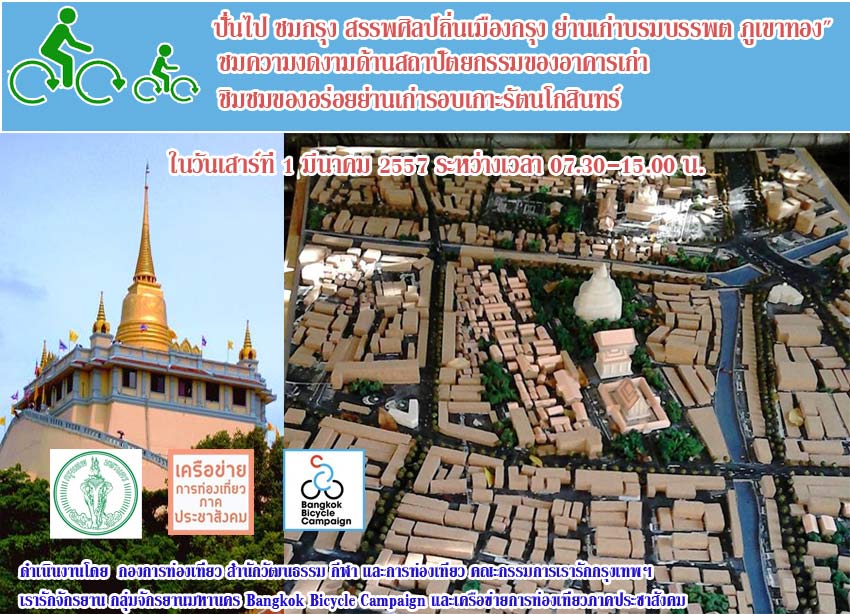 เชิญชวนปั่นไป ชมกรุง สรรพศิลป์ถิ่นเมืองกรุง ย่านเก่าบรมบรรพต" ในวันเสาร์ที่ 1 มีนาคม 2557 ระหว่างเวลา 07.30-15.00 น. ชมความงดงามด้านสถาปัตยกรรมของอาคารเก่า พร้อมชื่นชมกับศิลปกรรมและซึมซับกับประวัติศาสตร์ ชิมชมของอร่อยย่านเก่ารอบเกาะรัตนโกสินทร์