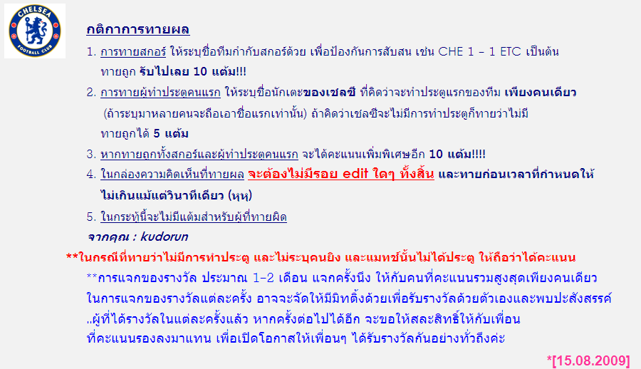 FULHAM V CHELSEA VENUE:Craven Cottage, KO:02:00 น., ทรูสปอร์ต 6 DATE: Wed, Apr 17, 2013 กติกาค่ะ ทายผลกับทางเว็บสโมสรลุ้นรับของรางวัลค่ะ https://scorepredictor.