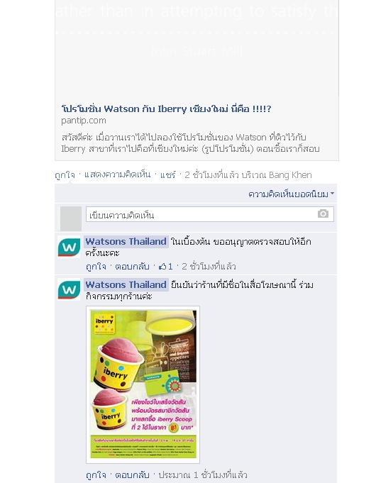 เรา: เราเห็นโบว์ชัวร์วัตสันแจ้งไว้ว่าที่นี่ร่วมรายการนะคะ (พร้อมหันไปถามเพื่อน เชียงใหม่มีสาขาเดียวใช่ไม๊วะ !!!!)