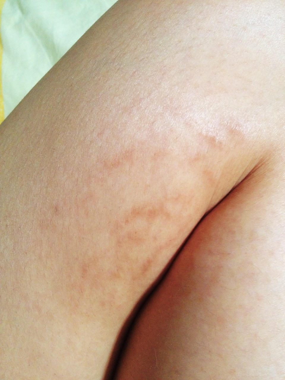 นี่คือรูปช่วงต้นขาจนถึงขาหนีบเรา มันแตกเป็นรอยยาว ตอนเมื่อ3เดือนก่อนแดงชัดเจน และเยอะน่าเกลียดกว่านี้มาก นี่มันจางลงกลายเป็นสีน้ำตาลไหม้แต่ก็ยังน่าเกลียดอยู่ดี