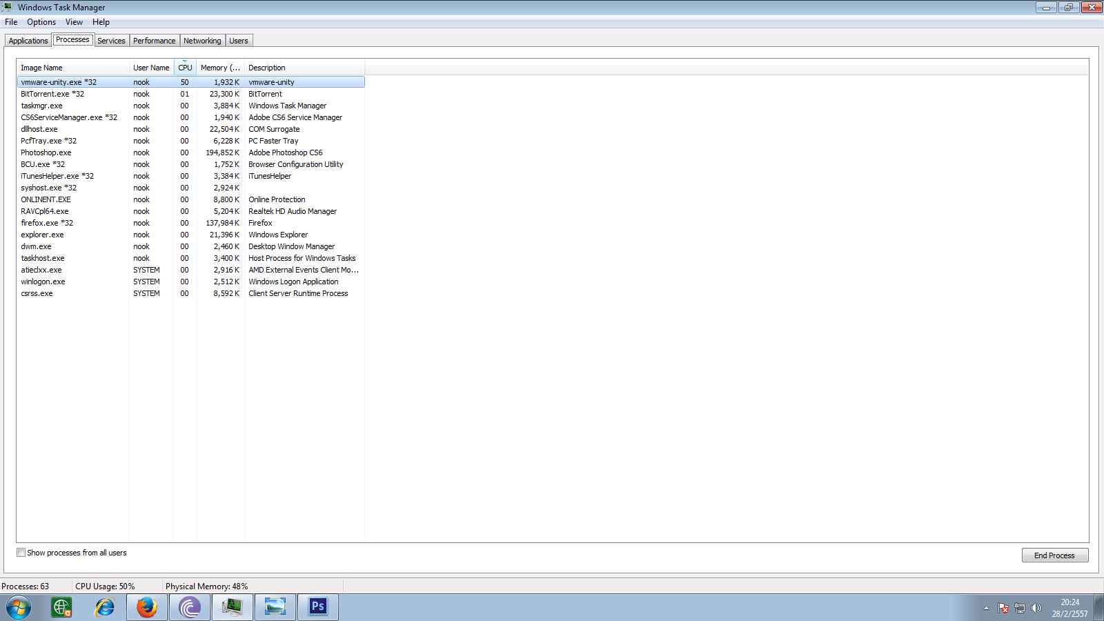 พอเปิดเครื่อง ปุ๊บเช็คดู vmware-unity.exe *32 cpu วิ่ง 50% เลยตามรูปบรรทัดแรกที่ไฮไลร์อ่ะครับเครื่องช้าลงแล้ว ค้างบ่อยๆ