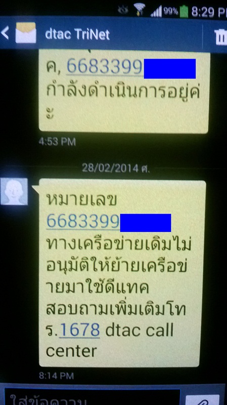 ในภาพเป็น sms จากศูนย์บริการลูกค้าดีแทค แจ้งว่าไม่สามารถย้ายเลขหมายได้เนื่องจาก " เครือข่ายเดิม " คือ ais ไม่อนุมัต ผมจึงขออนุญาตเรียนลำดับความดังนี้