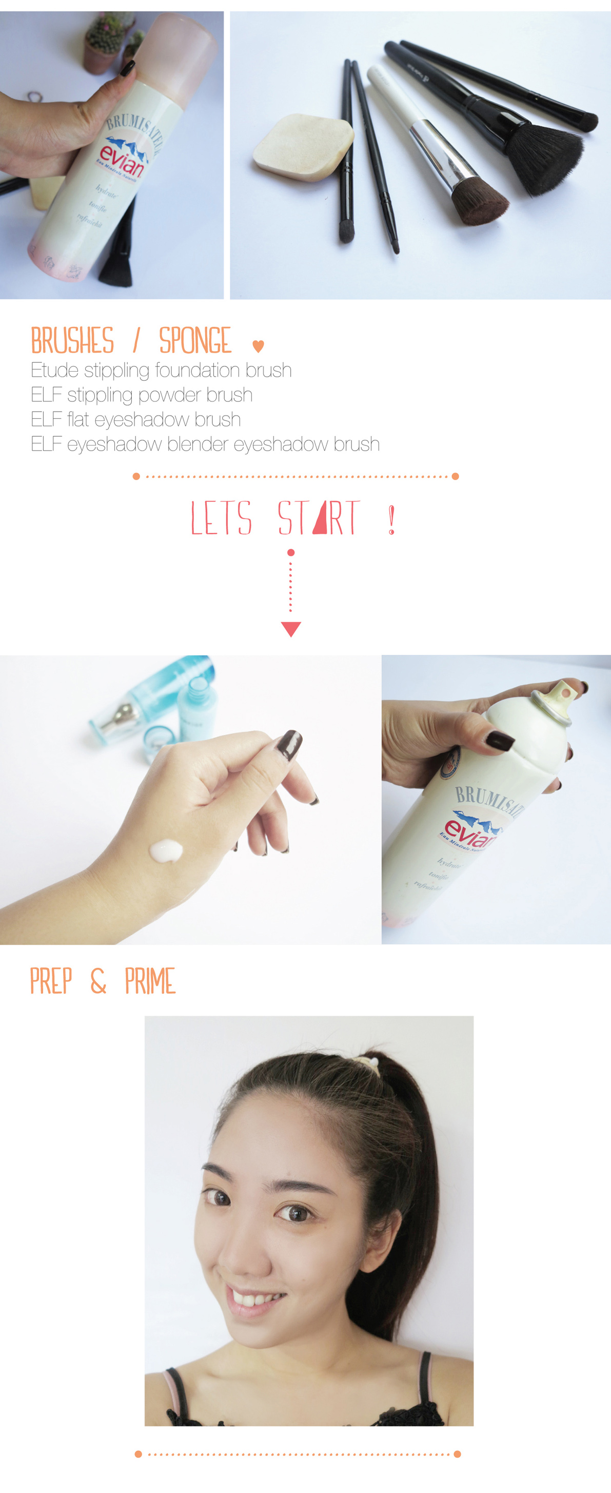 ก่อนอื่น ลี่ลงครีมบำรุงทั่วหน้าเพื่อเพิ่มความชุ่มชื้นให้กับใบหน้าแล้วตามด้วยการชีดน้ำแร่ หรือ spray mist ของอะไรก็ได้แล้วรอให้มันซึมเข้ารูขุมขน การชีดน้ำแร่นี่นอกจะทำให้หน้าสดชื่นแล้วยังทำให้เครื่องสำอางติดทนนานด้วยค่ะ
