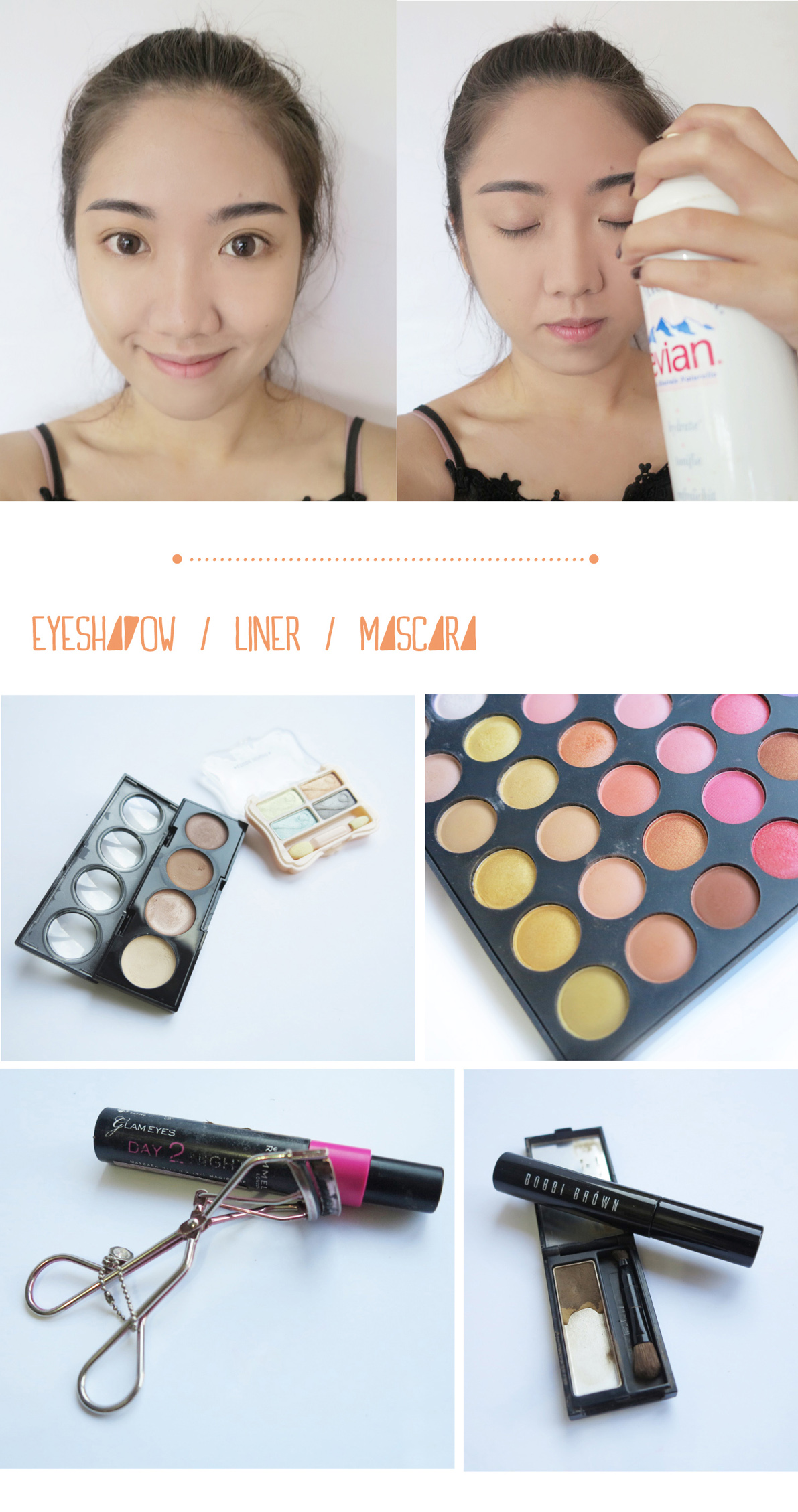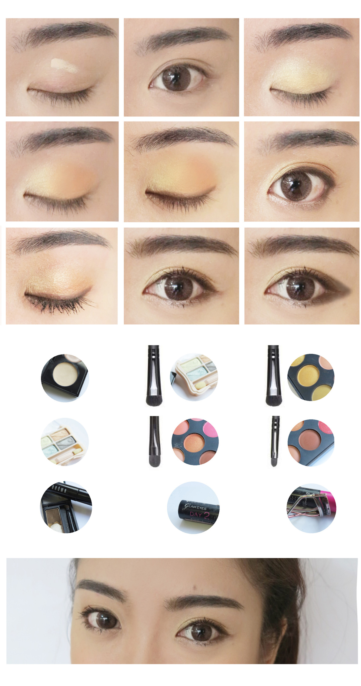 ดวงตา เริ่มจากการ prime เปลือกตาก่อน แล้วก็ลง eyeshadow แบบครีมค่ะ เพื่อให้สี eyeshadow แบบฝุ่นที่เราจะลงชัดขึ้น เริ่มจากสีเหลือนอ่อน shimmer - เหลืองเข้มเป็น matte - ส้ม shiimmer - ส้มสด matte - ใช้ eyeshadow สีน้ำตาลเข้มลงแทน eyeliner จะได้ดู soft ลง เขียนตาทั้งด้านบนและล่างให้เป็น V shape ออก droopy/หางตก นิดๆ - ตามด้วย mascara ทั้งขนตาบนและล่าง ลี่ไม่ได้ใส่ขนตาปรอมเพราะอยากให้ดูเป็นธรรมชาติๆค่ะ
