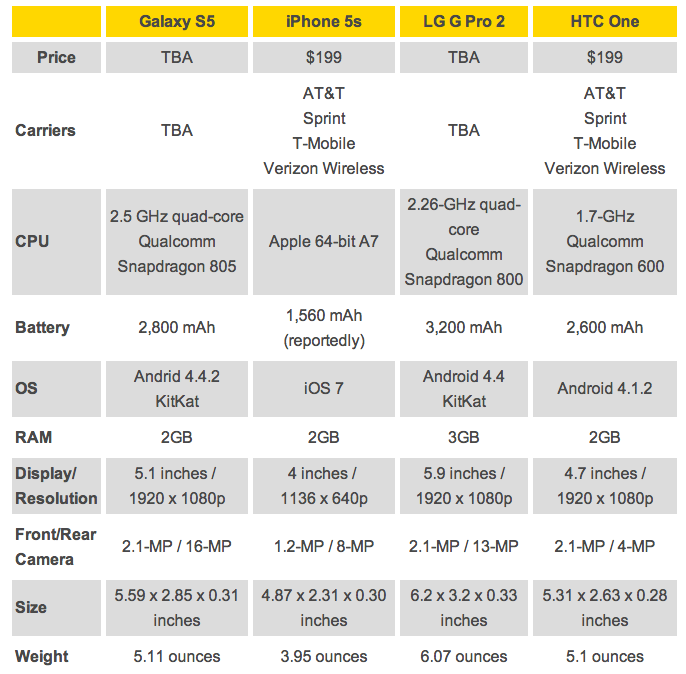 เปรียบเทียบ Galaxy S5, iPhone 5s, LG G Pro 2, HTC One มาดูกัน
