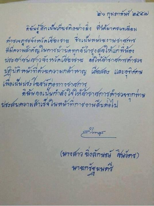นายกยิ่งลักษณ์เขียนจดหมายให้กำลังใจตำรวจ