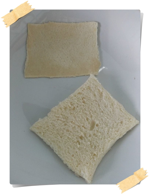 เอาขนมปังแผ่นมาตัดขอบออก แล้วรีดให้เป็นแผ่นบางๆ แบบนี้ค่ะ //ยุพิณใช้ขวดซอสมะเขือเทศกลิ้งๆๆ
