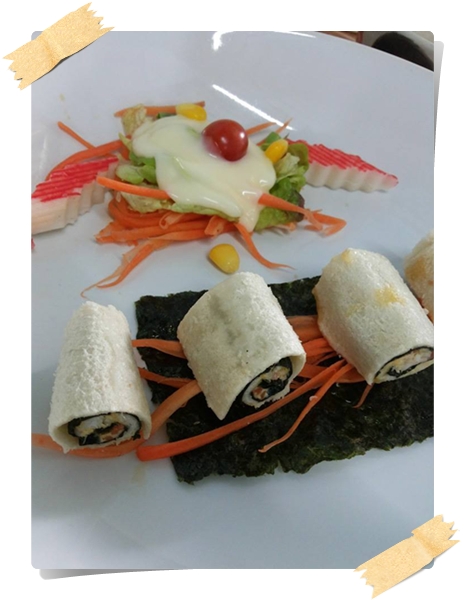 จัดการหั่นให้พอดีคำ แล้วจัดจาน เอาน้ำสลัดหยอดแล้วเอาสาหร่ายกับปูอัดแปะลงไป