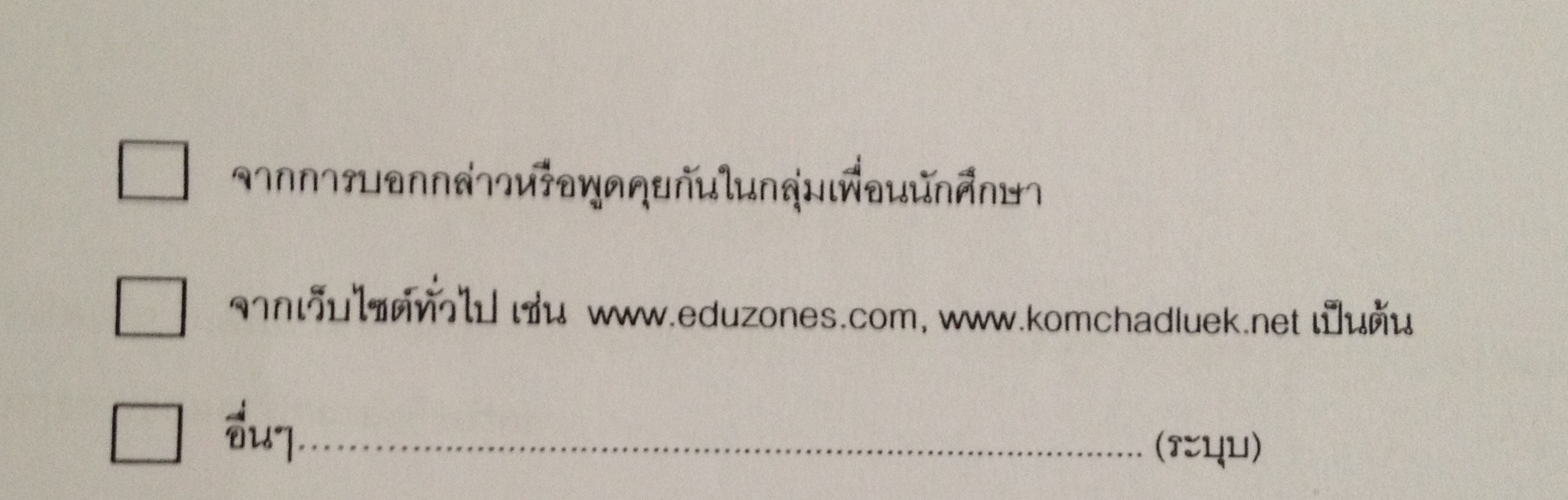 ทำวิจัยโดยใช้แบบสอบถามโดย ส่วนที่ 1 ข้อมูลทั่วไปของผู้ตอบแบบสอบถาม มีตัวแปรที่ให้ผู้ตอบเลือกตอบ 1 คำตอบ เช่น เพศ(ชาย/หญิง) การศึกษา(มัธยมฯ/ป.ตรี/ป.โท) ส่วนที่ 2 มีตัวแปรที่ให้ผู้ตอบเลือกตอบว่า มากที่