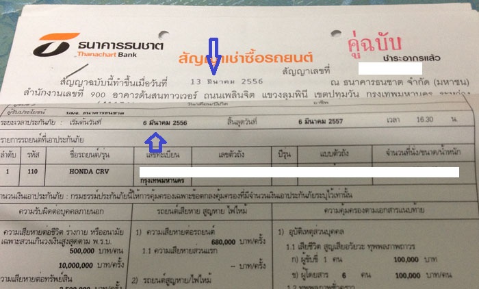วันที่ 13 มีนาคม 2556 สัญญาซื้อขายกับธนาคารธนชาตออกมา(ธนชาตครอบครองสิทธิ์ ผมครอบครองรถ) ผมได้รับทางไปรษณีย์ ต่อมาได้รับกรมธรรม์ด้วย
