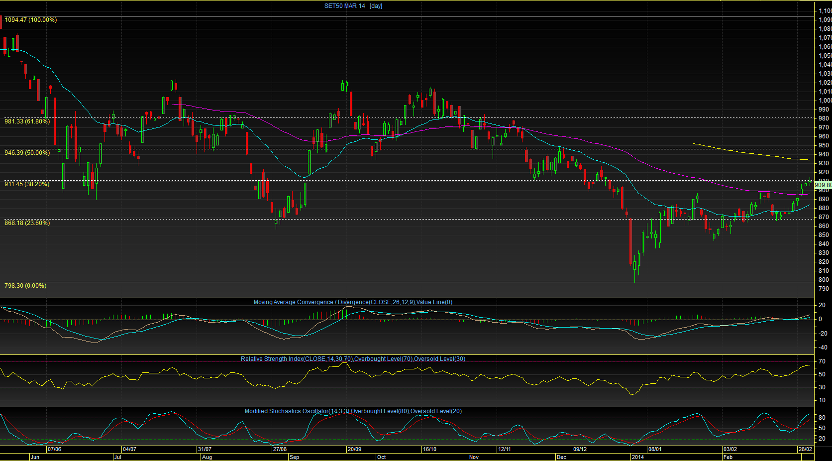 S50H14 TF Day : เมื่อวานนี้ แกว่งตัวในกรอบแคบ (904-914) แม้มีบางช่วงที่ทะลุ Fibo 38.2% ขึ้นไปได้ แต่ก็ไม่สามารถ