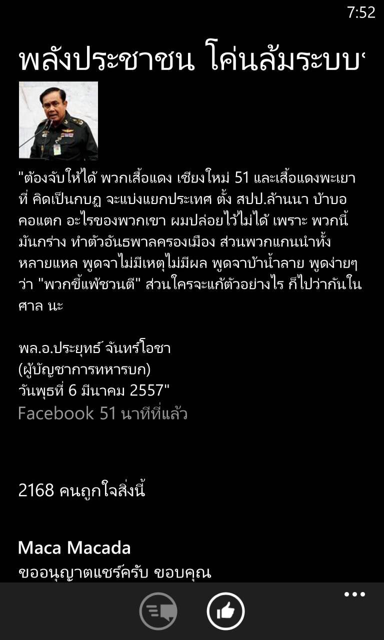 จากข้อความของท่านช่างกล้ากับประชาชนที่แสดงความคิดเห็นที่เค้าประชดประชัน แต่ท่านกลับไม่กล้าทำอะไรกับคนแก่ที่มารวมตัวกันเพื่อวางแผนล้มรัฐบาลหรือคนพวกนั้นสำคัญมากจนท่านไม่กล้าไปแตะต้องหรือกลัวคนเบี้ยงหลังพวกนั้นครับท่าน เมื่อคนพวกนั้นไม่มีตำแหน่งหรือยศอะไรในวงราชการแล้วก็ถือเป็นประชาชนธรรมดาแต่ท่านกลับเลือกที่จะทำกับคนอีกกลุ่มหรือแต่ไม่ทำกับอีกกลุ่มแบบนี่2มตราฐานหรือเปล่าครับ ต่อไปประชาชนเค้าจะคิดล้มระบบทหารมั้งนะครับถ้าท่านยังว่างตัวไม่เป็นกลางแบบนี่