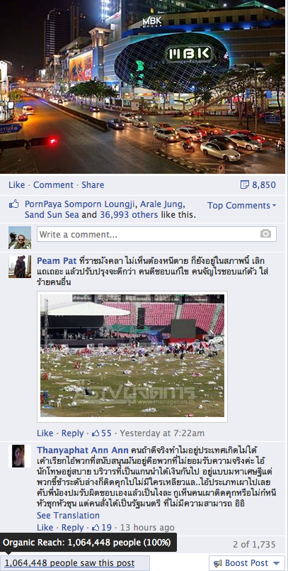ผมคิดว่าน่ะ อีกฝ่าย หนึ่งมีผู้สนับสนุน เป็นผู้ว่า กทม. มาจัดการเสร็จหลังชุมนุมเลย ดูสะอาด