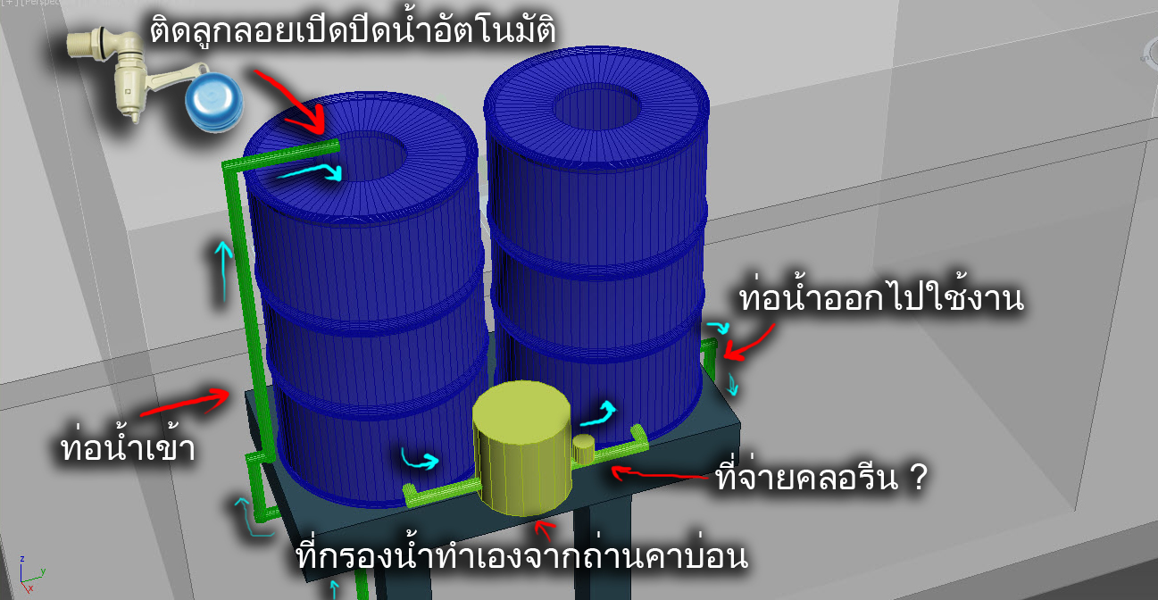 รูปด้านล่างนี้ เป็นหลักการคร่าวๆ ป.ล. ถังพักน้ำเป็นถังเคมี มันใส่ sorbitol70% solution ผมล้างไปสามรอบหวังว่ามันจะไม่มีพิษนะครับ ขนาดถังพลาสติกลูกละ250ลิตรครับ ซื้อมาลูกละ400จากร้านขายถังมือสอง ผมต้องติดที่กรองน้ำ(ทำเอง)เอาไว้ระหว่างกลาง เพราะว่าถ้าให้น้ำผ่านใส้กรองประปาหมู่บ้านมันจะไม่มีแรงดันพอให้ส่งน้ำขึ้นไปใส่ถัง ถ้าต้องติดปั้มผมรู้สึกว่ามันไม่ใช่ทางแก้เรื่องกระประหยัดพลังงาน