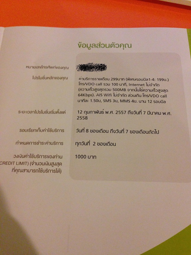 หลังจากที่เปิดบริการ AIS มา 2 อาทิตย์เอกสารชิ้นนี้ก็ส่งมาถึงบ้าน ภายในเอกสาร ระบุและบอกเราชัดเจนว่าเราใช้โปรอะไร ระยะโปรโมชั่นที่เราได้รับ รอบบิล และระยะเวลาการชำระ ทำให้ผู้ใช้สามารถวางแผน ควบคุมการใช้ได้ด้วยตัวเอง....เรื่องเล็กๆที่น่าสนใจดี