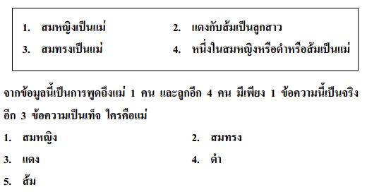 จากข้อ 4 เป็นจริงแสดงว่า ส้มเป็นแม่ เพราะอีก 2 คนเป็นลูกสาวไปแล้ว