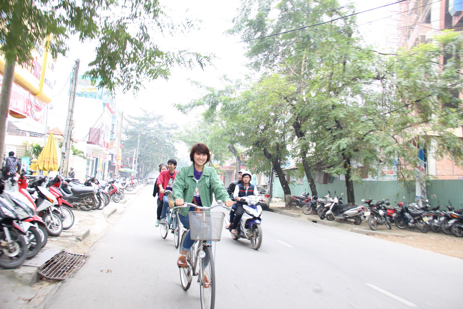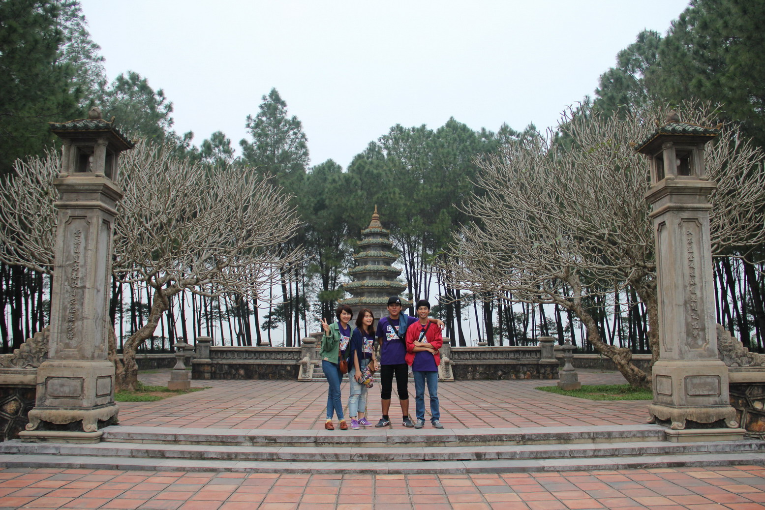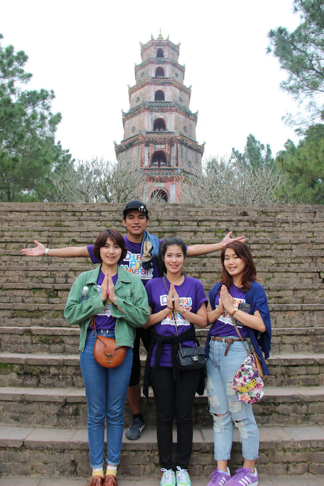 หลังจากนั้นเราปั่นจักรยานต่อไปยัง วัดเทียนมู่(Tien Mu) วัดแห่งนี้เป็นศูนย์กลางทางพุทธศาสนานิกายเซน จุดเด่นที่สุดของวัดแห่งนี้คือ เจดีย์ทรงเก๋ง 8 เหลี่ยมสูงลดหลั่นกัน 7 ชั้น แต่ละชั้นเป็นตัวแทนของชาติภพต่างๆของพระพุทธเจ้า ที่นี่เราได้พบกับรุ่นน้องนักศึกษาจากมหาวิทยาลัยเว้ด้วยค่ะ น้องทุกคนน่ารักและเป็นกันเองมาก ตกเย็นเราก็ปั่นจักรยานแวะหาร้านอาหารทานกัน เมนูเย็นวันนั้นเรียกว่า เฝอ คือก๋วยเตี๋ยวเวียดนามแต่น้ำซุปจะใสกว่าบ้านเราส่วนรสชาติอร่อยกลมกล่อมดีค่ะ