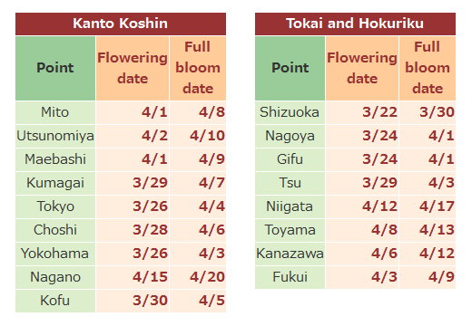 ※ ขอเขียนวันที่ตามวันที่พยากรณ์ออกนะคะ พยากรณ์ล่าสุด จะบานช้าลงไปอีกค่า Mito(Ibaraki) / Utsunomiya(Tochigi) / Maebashi(Gunma) / Kumagaya(Saitama) / Choshi(Chiba) / Yokohama(Kanagawa) / Kofu(Ya