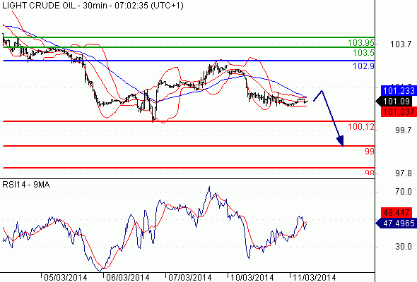 Our preference: Short positions below 102.9 with targets @ 100.12 & 99 in extension.