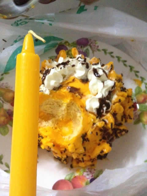 พอผ่านวิกฤตินั้นมาได้แล้วรู้สึกว่าทำไมมันเหมือนเทียนจัง ทั้งสี ทั้งรสชาติ เลยลองเอาเทียนมาเทียบดู ปรากฏว่าเหมือนเป๊ะ!! นี่มันเค้กเทียนไขชัดๆ
