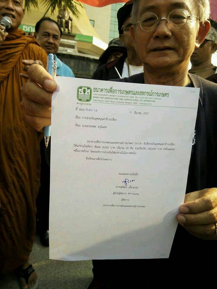 ธกส. สนง.ใหญ่ ยอมรับซื้อข้าวเปลือกจาก พุทธอิสระ ในราคา ตันละ 8,000 บาท จำนวน 20 ตัน