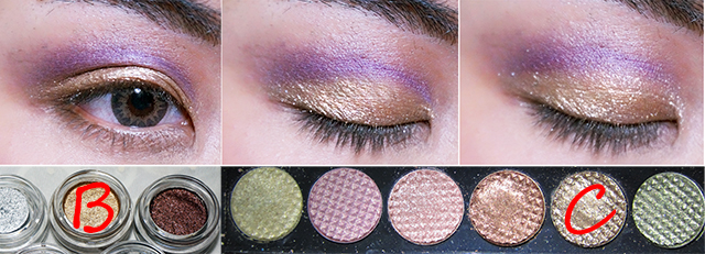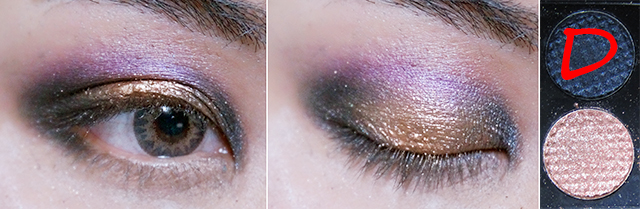2. ลง eye shadow แบบฝุ่น สีทอง (C) ทับ