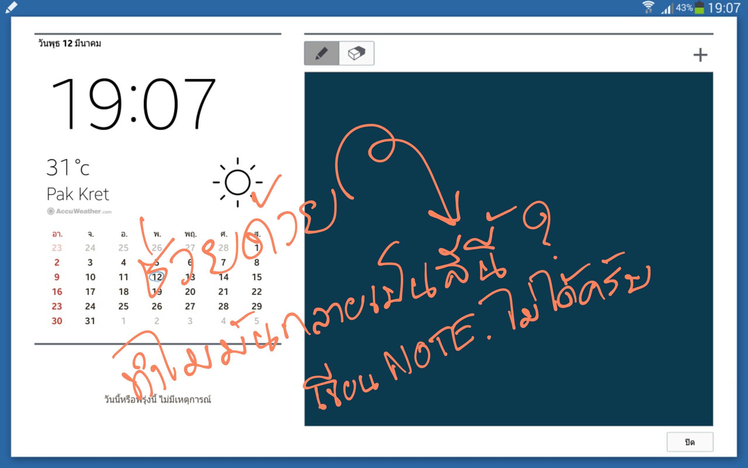 ในขณะที่เครื่องปิดหน้าจออยู่ ถ้าดึงปากกาออกมาแล้วเขียน ปกติจะได้พื้นหลังสีขาว แต่ตอนนี้เป็นสีดำ ไม่ทราบต้องไปตั้งค่าตรงไหน