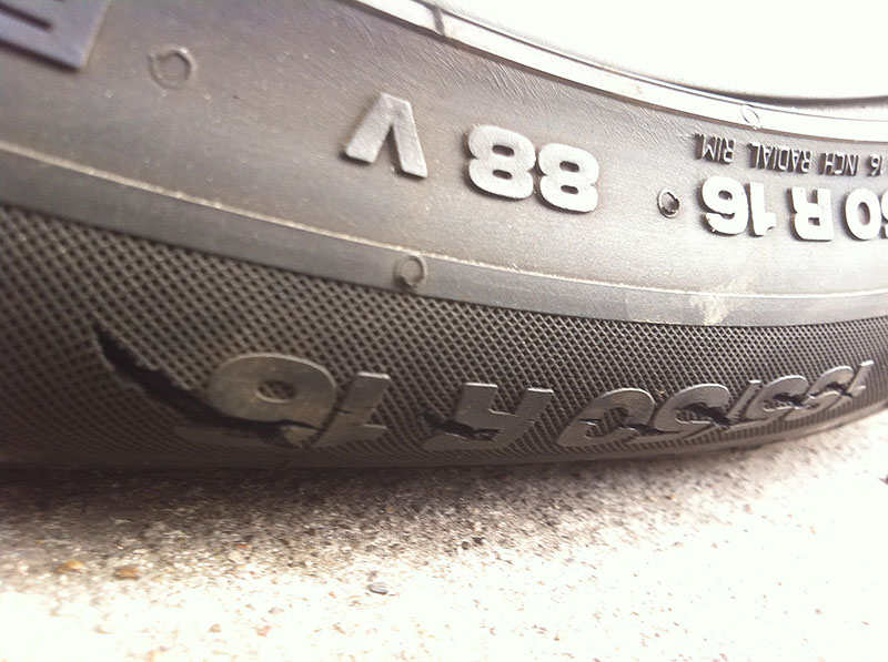 ยางรถฉีกเพราะไปเบียดกับฟุตบาทอย่างนี้ จะต้องซ่อมหรือเปลี่ยนไหมครับ